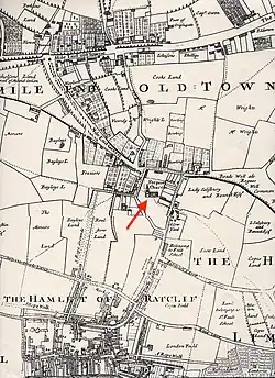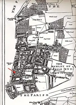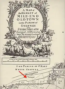 The medieval parish of St Dunstan's, Stepney was an area of 7 square miles lying between the wall of the City of London and the River Lea to the east, where Essex began. It was mostly open fields or marshland. In Gascoyne's day it was still largely intact, though four settlements had been hived off and given independent status.[52] It was still predominately farmland, except up against the City, where it was "pestered" by houses, often illegally built,[53] and along the densely built river front — London's rapidly growing maritime area, known as Sailor Town. By the end of the 19th century the area would have a million people and be better known as the East End of London.