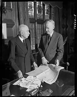 Lt.Col. J.B. Maclean (left) and Horace Hunter with a copy of The Financial Post, 1947