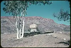 John Flynn died in Sydney on 5 May 1951 and, as requested, his ashes were flown to Alice Springs where they were buried in a temporary location near this site. A funeral was held here on 23 May 1951 with over 500 people in attendance. A more permanent grave was finalised in August 1953 when the urn containing his ashes was placed into a newly built monument and a boulder was placed over it.[2] Having a boulder covering the grave was chosen by his wife Jean Flynn, later also buried here (14 November 1976), who was motivated by the biblical story of a large rock being rolled over the grave of Jesus.[4] At this time a plaque was also placed on the grave saying that Flynn "brought gladness and rejoicing to the wilderness and the solitary places".[5]