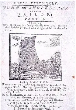 However, although Marshall advocated more disciplined stories, he also published Newbery-inspired stories that "stressed amusement" and would sell well, including fairy tales.[23] By the mid-1780s, he was focusing almost exclusively on moral works with a strong Christian element. As Samuel Pickering, Jr., a scholar of 18th-century children's literature, explains, "He was a shrewd publisher and, reading the market well, he saw that instruction would sell. While keeping a selection of old-fashioned, amusing books in print... he established a reputation as a printer of moral works."[24] Mary Jackson describes his strategy in sharper terms, saying he engaged in "apparent duplicity and sharp tricks", claiming he was a reforming publisher but issuing tales that had little moral redemption in the eyes of Trimmer, Fenn, Kilner, and others.[25] In 1795, he became a printer for Hannah More's Cheap Repository Tracts.[24]