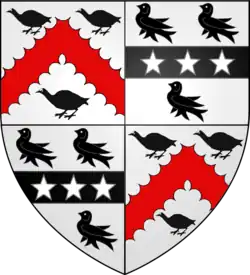 1st and 3rd: Argent, a chevron engrailed gules between three coots sable (Southcott Arms). 2nd and 4th: Argent, a fess sable with three mullets argent between three martlets sable (Pury Arms).