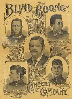 Boone's mother, Rachel Boone Hendricks (when she married Harrison Hendricks in 1871, she used the Boone surname),[2] worried that her son would find life too difficult without some sort of education. Because of this, his hometown of Warrensburg decided to make sure that Boone received an education and paid for him to attend the Missouri School for the Blind where he played the piano for first time. After growing bored with his experience there (they tried to teach him to make brooms), Boone's habitual rule breaking (sneaking off at night to listen to piano music at the local barrooms) got him expelled. He returned to Warrensburg where he began to wander, playing with local musicians. He was actually kidnapped for a time by a gambler and sometime showman, Mark Cromwell, until his step-father, Harrison Hendricks caught up with them in Mexico, Missouri. In 1879, Boone was "discovered" by Columbia, Missouri contractor, John B. Lange, Jr., who put Boone on the road, as Blind John. Only meager financial success was attained until Boone was boarded for two months at the home of George Sampson in Iowa. Mrs. Sampson was an accomplished pianist herself and taught Boone how to properly play the great European masters. It is said she taught him not only their minds, but their hearts as well. Upon his return to Iowa, Lange found his young protege had acquired much new skill, and with the addition of a vocalist, began billing as the Blind Boone Concert Company. The Company worked hard, traveling from town to town on a whistle-stop like tour. They began to acquire fame and fortune, returning to Columbia in 1887 with a large sum of money to deposit in their bank account. By the new century, they were among the most popular acts in the country, playing 300-plus dates annually. John Lange died in Kansas City in 1916. In 1889, Boone had married John Lange's daughter, Eugenia Lange. Boone continued on, touring the eastern US in 1919, spending an entire month in New York city. Upon announcing his retirement from touring in 1924, Boone was described by a Kansas City newspaper as having, "combined talent with hard work to make life worth living." Due to financial difficulties brought on by a less than adequate manager, Boone continued to play concerts until the spring of 1927. He died of acute dilation of the heart on October 4, 1927, in Warrensburg. He was buried at the Columbia Cemetery.[3] "Blind Boone, His Early Life and Achievements," Mrs. Melissa Fuell-Cuther, B.S.D., Evangel Pub. Society, Robbins, Tennessee, 1918.