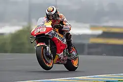His first victory of the season came during a wet race at Aragon, his first win at the circuit.[61] Lorenzo followed that victory up with a victory in the next race at Motegi,[62] having also won at the circuit in 2009 and 2013.[63] For the majority of the season, Lorenzo was involved in a three-way rivalry with teammate Rossi and Dani Pedrosa to claim the runner-up position overall. At Valencia, Lorenzo took the decision to swap bikes – on lap 20 – as light rain fell. He struggled to get the bike stopped in the uncertain conditions and dropped down the order; he ultimately retired from the race.[64] He finished third in the final championship standings behind Márquez and Rossi, with 263 points.[65]