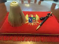 The three main symbols of the school, A Pickelhaube with a white plume used for parades, the coat of arms of the school, and the dagger which cadets receive upon 2 months of entering the school.