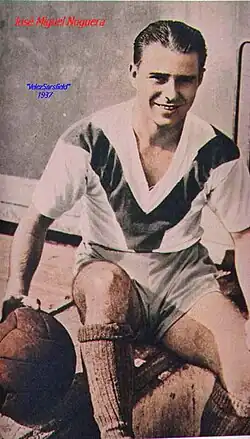 José Noguera's only brother, Enrique, was also a professional footballer. José and Enrique played two games together defending the Velez colors. Enrique played left wing and José could play either inside left or inside right in the forward line due to his superb skill with both feet.[1] In today's modern football, the inside forward positions are referred to as the playmaker position. Although Noguera was a prolific goal scorer, his greatest contribution to the forward line was his ability to make the pass for the goal. He was more of a playmaker due to his extraordinary ability to elude his opponents. Noguera lacked power when shooting at goal but he had an extraordinary ability to place the ball where he wanted. This is why he was usually picked to take the penalty kicks. [1] [2] [3]