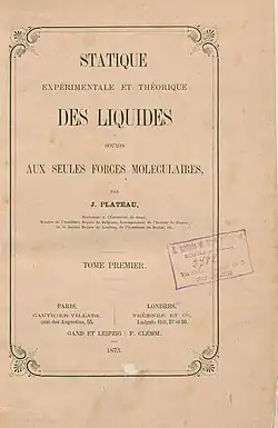 - ^ Plateau, J. (1873). Statique expérimentale et théorique des liquides soumis aux seules forces moléculaires [Experimental and theoretical statics of liquids subject to only molecular forces] (in French). Paris, France: Gauthier-Villars. OCLC 809459725. vol. 1 and vol. 2.