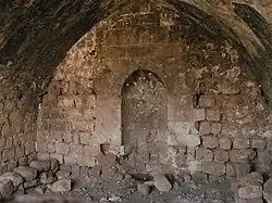 As to the time this addition was built, there is very little information to shed light on it. If there had indeed been an engraving in the gate which was visible in 1674, it is reasonable to assume that it was covered over by the new building. In the year 1810, at the time between the two earthquakes, the khan is already described as partially in ruin, perhaps following the quake of 1759. Those who built the addition must have repaired the ruins of the long western hall, because it wouldn't have made sense to build a fancy addition over a ruined structure. And indeed, its construction is of better quality than the rest of the khan. Most of it is built over a ruined structure. When this addition was being built, an opening was made between the roof of the cistern, which is surrounded by a wall, to the room to the southern side of it, and a machrab was built in it. Access to the water hole was probably from within the khan, through this room only. There are several protruding stones on this wall, which may be the remains of a staircase, but in the drawing by Baron Taylor from 1839, the wall appears intact without any opening.[10]