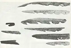 One individual buried in one of the ossuaries contained an unusual personal kit containing tools, skins, animal bones, a red stone tablet and a strike-a-light set. No other individuals had grave goods so it may be that this individual was prominent in the community or that we was a shaman or medicine man.[4]