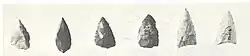 • Stone tools including 245 scrapers and 198 projectile points (of which 133 were triangular Juntunen points as defined by the excavators)