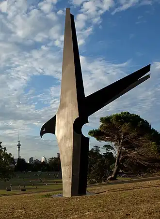 Kaitiaki (English: "Guardian")[2] is an 11.8-metre-high (39 ft) black powder-coated steel sculpture that depicts a kāhu pōkere (harrier hawk).[2][4] Graham chose a kāhu pōkere for the piece due to its appearance in Ngāti Whātua and Tainui oral histories as a guardian that was present in Aotearoa New Zealand prior to the first inhabitants.[3][4]
