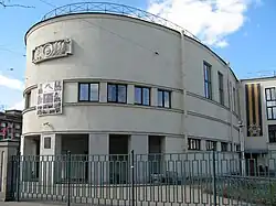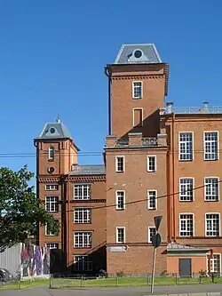 In the vicinity of the street there also have been some buildings originally erected by 1914 for the joint stock Russian Renault[17][18] automobile works. The buildings were added[19] to over the decades after the Soviet nationalisation. Having been many times restructured under different names, this machine-building factory was eventually given the name of its head designer of its main products - aviation engines[20] Academician Vladimir Klimov, whose name was also given to the adjoining city square with a roundabout. By 2020 the factory premises have been vacated for redevelopment,[20] mostly for housing purposes. For retail consumers the factory produced gas lighters and was entrusted to design the torch[18] for the 1980 Summer Olympic Games that were held in Soviet Union in Moscow, Leningrad, Tallinn etc. Two mansions built before 1917 can be seen in the street (No 17[21]) and next to it.[22]