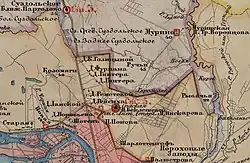 Northeastern part and suburbs of 1854 Saint Petersburg with Murino estate in a red rectangle
