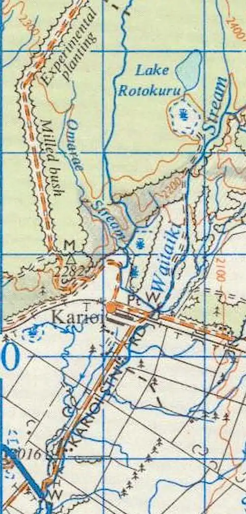 The name was changed to Ninnia, or Ninia in 1907,[4] but reverted to Karioi in 1910,[5] though Ninia was still on the 1926 map.[6] Ninia was also later used, further north on the NIMT, at Waione Siding.[7] Karioi settlement lay 2 mi (3.2 km)[8] to the south[9] at what is now Karioi Domain.[10]