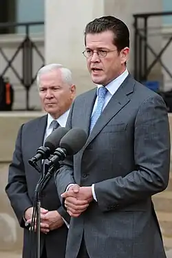 The first political challenge facing defence minister Guttenberg was dealing with the Kunduz airstrike of 4 September 2009. Initially, he adopted the position of his predecessor Jung and defended the air strike as "militarily appropriate". However, in contrast to Jung, Guttenberg conceded that the strike had also caused civilian casualties.[85] After Guttenberg had received additional information and investigative reports dating back to the tenure of his predecessor Jung, Guttenberg changed his position concerning the "Kunduz airstrike"[86] and dismissed Bundeswehr Chief of Staff Schneiderhahn and Parliamentary State Secretary of Defence Wichert on 26 November 2009.[87]