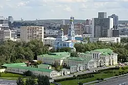 The Rastorguyev–Kharitonov Palace (Russian: Усадьба Расторгуевых–Харитоновых) is a palace in Yekaterinburg, Russia, an architectural monument of federal significance. This Neoclassical townhouse was commissioned in 1794 by Lev Rastorguyev, an Old Believer merchant and landowner. The main house was built on the so-called Annunciation Hill in Yekaterinburg. The nearby Annunciation Church was built at the same time.