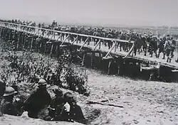 The Soviet 12th Army evacuated from Kiev on 6 May.[32] "Those beasts", wrote Piłsudski to General Sosnkowski on 6 May, "instead of defending Kiev, flee from there".[31] The Polish offensive stopped at Kiev and the front was formed along the Dnieper.[33] The combined Polish-Ukrainian forces under General Rydz-Śmigły entered the city on 7 May.[25][33] A bridgehead was established and reached 15 kilometers east of the Dnieper, which was as far as the Polish 3rd Army advanced.[30] About 20,000 Red Army troops had been taken prisoner by 2 May.[31] Only 150 Polish soldiers died during the entire operation.[15]
