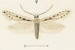 The wingspan is 12–13 mm. The forewings are light ochreous-brown, suffusedly irrorated with whitish, tending to leave a more or less clear longitudinal median streak of ground colour. There is a blackish mark on the fold towards the base. The discal stigmata are rather large and black, the plical represented by a dark fuscous or brown cloud, very obliquely before the first discal. There are several cloudy blackish or dark fuscous dots on the posterior part of the costa and termen. The hindwings are light grey.[2]