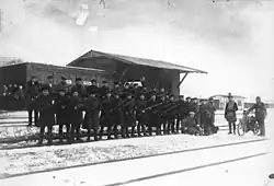 The contingent was divided into three armed groups. The first and strongest group (530 men commanded by Major Jonas Išlinskas codename Aukštuolis) was ordered to take Klaipėda. The second group (443 men led by Captain Mykolas Kalmantavičius codename Bajoras) was sent to capture Pagėgiai (Pogegen) and secure the border with Germany and the third (103 men led by Major Petras Jakštas codename Kalvaitis) to Šilutė (Heydekrug).[42] By January 11, the pro-Lithuanian forces controlled the region, except for the city of Klaipėda. The French administrator Pestiné refused to surrender and fighting over Klaipėda broke out on January 15. The city was defended by 250 French soldiers, 350 German policemen, and 300 civilian volunteers.[56] After a brief gunfight, a ceasefire was signed by Pestiné and Budrys and the French soldiers were interned in their barracks.[57] During the fighting, 12 insurgents, two French soldiers, and one German policeman were killed.[9] According to German sources, one French soldier died and two were injured.[57] On January 16, the Polish ship Komendant Piłsudski entered the port of Klaipėda carrying Colonel Eugène Trousson, a member of the French military mission in Poland, and reinforcements to French troops.[58] However, the ship soon departed as the fighting was over and ceasefire was in effect. On January 17–18, the British cruiser HMS Caledon and two French torpedo boats, Algérien and Senégalais, reached Klaipėda. The French cruiser Voltaire was on its way.[59] The Lithuanians began organizing a local army, which included 317 men by January 24. The men were enticed by a guaranteed six-month position and a wage of two litas a day.[60]