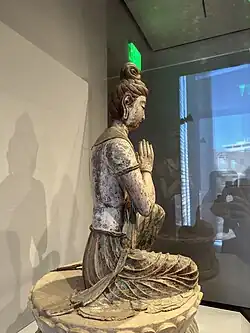 The Kneeling Attendant Bodhisattva is a late 7th century, polychromed Buddhist sculpture, dating to the Tang dynasty, depicting a kneeling bodhisattva. Once a part of a set of eight figures, depicting six bodhisattvas and two disciples of the Buddha, it was once a part of the Mogao Caves, but is currently on display at the Harvard Art Museum.[1]
