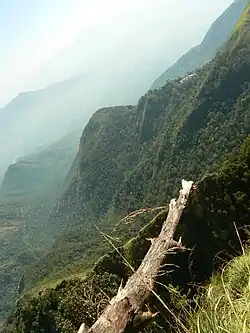 There are several well established side roads and other intersecting minor trails which branch off from the Kodaikanal–Munnar Road. Most of these show as "other trails" on the 1959 Army map.[21] These intersections either go north to Upper Palani Hills villages or go south, dropping sharply down the south facing escarpment to hill villages en route and towns on the plains up to 1,800 m (5,900 ft) below. The Ciff Trail provides an alternate east–west route between Berijam Lake and the Kerala Forest Bungalow. There are over 40 recognized hiking routes from Kodaikanal using the Munnar road and these other trails.[25]