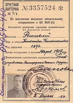 Communist party Membership card issued to Rokossovsky, following his reinstatement in 1940