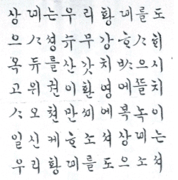 While the copy appearing in the source[6] appears markedly newer than the 1900s and calls it the "Korean national anthem" (Korean: 죠션 국가) instead of "Patriotic song of the Korean Empire" (大韓帝國愛國歌) as one would expect from a 1900s original, it clearly shows pre-1933 orthography (reproduced here) that was not used after the 1940s.
