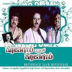 Kothigalu Saar Kothigalu (transl.Monkeys, sir, monkeys) is a 2001 Indian Kannada comedy film directed by Rajendra Singh Babu. The film stars Ramesh Aravind, S. Narayan, Mohan, Prema, Tara and Urvashi in the lead roles. This is the second film in the Saar series directed by Babu[1] and was released on 28 December 2001 and received generally positive reviews from the critics and turned out to be a box office hit. It completed a 100-day run in theatres.[2] The film was remade in Telugu as Sandade Sandadi (2002), in Hindi as Shaadi No. 1 (2005) and in Bangladeshi Bengali as Tomakei Khujchi (2008).