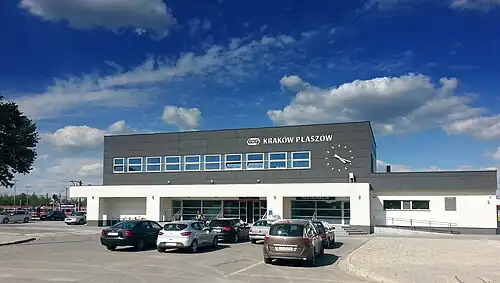 Kraków Płaszów railway station is a railway station in Płaszów, a suburb of Kraków (Lesser Poland), Poland. As of 2022, it is served by Koleje Małopolskie (KMŁ),Polregio, and PKP Intercity (EIP, InterCity, and TLK services). The station is located near Kraków-Płaszów concentration camp. The station is about 4.5 km southeast of Kraków Główny (Main) station.