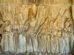 It is constituted by an originally open-air bas-relief dedicated to Krishna, dating to the mid-seventh century, which was later enclosed within a mandapa in the 16th century during the Vijayanagara Empire.[3] Notable carvings inside are sculpted panels that bring out the story of Krishna lifting the Govardhana Hill to protect the cowherds and gopis (milk maids) from heavy rains and floods – the "most poetic and endearing" Indian or Angkor sculpture-based representation of this legend[5] – and there are also scenes of Krishna frolicking with the milk maids.[6][7]