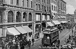 Construction of the Sagene Line commenced in early 1899. The final line, from Storgaten to Festningsbryggen, was approved by the city council in May 1899, at a cost of NOK 200,000. At about that time the construction of the Rodeløkka Line started. The Sagene Line line was somewhat delayed and operations started on 24 November. It initially received a ten-minute headway because the power company was not able to supply sufficient power to run additional trams. This was later increased to five minutes. The company had not had capacity to straight out all aspects of operations, including that of procuring uniforms. The lack of such attire was criticized by the press.[5] At first the service ran from Sagene to Athenæum, with additional services from St. Hanshaugen to Athenæum.[6]