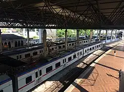 The Kuala Lumpur railway station is a Malaysian railway station located in Kuala Lumpur. Construction began in 1910 and was fully completed in 1917.[1] Replacing an older station on the same site, the station was Kuala Lumpur's railway hub in the city for the Federated Malay States Railways and its successor Keretapi Tanah Melayu (English: Malayan Railways), before Kuala Lumpur Sentral station assumed much of its role in 2001. The station is notable for its architecture, adopting a mixture of Eastern and Western designs.