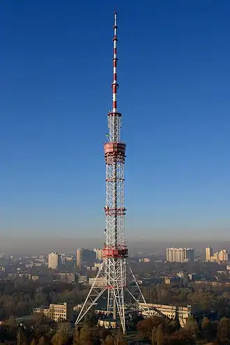 The Kyiv TV Tower (Ukrainian: Київська телевежа, romanizedKyivska televezha) is a 385 m-high (1,263 ft) lattice metal tower[1] on Oranzhereina Street, Kyiv, Ukraine, and is the tallest structure in the country.[2] The tower was built in 1973 while Kyiv was the capital of Ukrainian SSR.[3] The tower was the tallest freestanding metal structure in the world.[1][2] It is used for radio and television broadcasting and is not open to the public.[1] It is the tallest lattice tower in the world and third tallest structure in Europe.