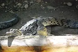 The main attraction, which is unique to this part of the Costa Chica is the lagoon, which is the estuary of the Tonameca River.[1] The lagoon is cut off from the sea by the beach much of the year and is full of mangroves as well as a wide variety of wildlife. The two principle mangrove types here are the red mangrove (Rhizophora mangle) and the white mangrove (Laguncularia racemosa). Tannins from the roots of the red mangrove turn the lagoon's water reddish in the shallows and black in deeper areas.[1] In the mornings, the lagoon fills with the sounds of the many birds that can be found here, including woodpeckers, kingfishers, ducks, storks cormorants, herons and others.[1][3][4] The area also has crustaceans, turtles, deer, and iguanas, but what attracts the tourists are the crocodiles.[1][6] During the rainy season the lagoon meets the sea and prompts sea life such as sea turtles, dolphins and fish to enter to feed on the crustaceans.[6] There is also another mangrove area nearby on the Copalita River.[4] Also nearby is the Rancho El Potrero, where iguanas are hatched and raised.[6]