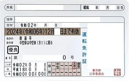 Japanese driving licence sample with category for heavy motorcycle (大自二) circled.