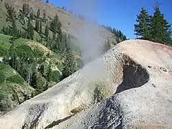 The source of heat for the volcanism in the Lassen area is subduction of the Gorda plate diving below the North American plate off the Northern California coast.[5] The area surrounding Lassen Peak is still active with boiling mud pots, fumaroles, and hot springs.[6]
