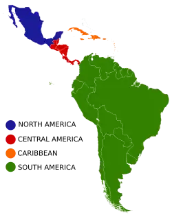 Latin America can be subdivided into several subregions based on geography, politics, democracy, demographics and culture. The basic geographical subregions are North America, Central America, the Caribbean and South America; the latter contains further politico-geographical subdivisions such as the Southern Cone, the Guianas and the Andean states. It may be subdivided on linguistic grounds into Spanish America and Portuguese America, and by some definitions, French America.[38]