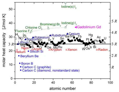 The molar heat capacity of most elements at 25 °C plotted as a function of atomic number. The value of bromine is for the gaseous state. For iodine, a value for the gas and one for the solid is shown.