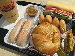 Typical Lee's Sandwiches fare, pictured here at the Taipei location, includes croissant sandwiches, special combination bánh mì, gỏi cuốn, and iced coffee.