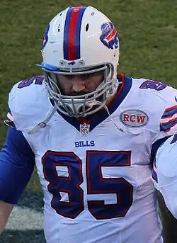 Upon arriving, he was the Bills' third tight end on their depth chart behind Scott Chandler and Mike Caussin.[13] On October 2, 2011, Smith made his professional regular season debut in the Bills' 23–20 loss at the Cincinnati Bengals. He became the backup tight end after Mike Caussin suffered a knee injury and was placed on injured/reserve on November 7, 2011. During a Week 12 matchup at the New York Jets, Smith made his first career start as the Bills lost 28–24.[14] On December 4, 2011, he caught a season-high three passes for 11-yards during a 23–17 loss to the Tennessee Titans. He entered the game after Scott Chandler injured his ankle and was unable to return.[15] He finished his rookie season with four receptions for 11 yards in three starts and ten games.[16]