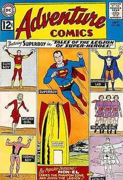 Although intended as a one-off story focusing on Superboy, the Legion proved popular and returned in Adventure Comics #267 (December 1959). In this story, Lightning Boy is renamed Lightning Lad and the members are redesigned. The Legion's popularity grew, and they appeared in further stories in Adventure Comics, Action Comics, and other titles edited by Mort Weisinger over the next few years.[2] The ranks of the Legion, only hinted at in those first two stories, was filled with new heroes such as Chameleon Boy, Invisible Kid, Colossal Boy, Star Boy, Brainiac 5, Triplicate Girl, Shrinking Violet, Sun Boy, Bouncing Boy, Phantom Girl, Ultra Boy, and Supergirl.[3][4]