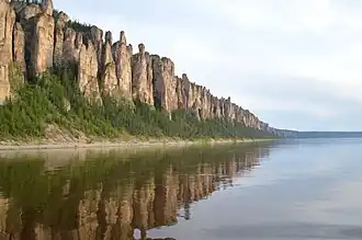 The Lena Pillars (Russian: Ле́нские столбы́, romanizedLenskiye Stolby; Yakut: Өлүөнэ туруук хайалара, Ölüöne Turūk Khayalara) are a natural rock formation along the banks of the Lena River in far eastern Siberia. The pillars are 150–300 metres (490–980 ft) high, and were formed in some of the Cambrian period sea-basins. The highest density of pillars is reached between the villages of Petrovskoye and Tit-Ary. The Lena Pillars Nature Park was inscribed on the World Heritage List in 2012.[1]
