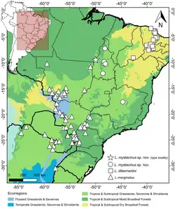 | Geographic distribution of Leptophis mystacinus (type locality [★] and other known localities [⬤]) | |