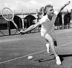 Hoad was unable to play the South Australian tennis championship in early January due to a torn ligament.[139] To some surprise he entered the mixed doubles event at the Australian Championships with his girlfriend Jenny Staley and the pair finished as runner-ups to Thelma Coyne Long and George Worthington.[140] In singles, he reached his first Grand Slam final after solid wins over Seixas (quarterfinal) and Hartwig (semifinal), but Rosewall's accuracy and control were too strong for him in the final and he lost in straight sets.[141] Hoad won the Northern Suburbs tournament in Sydney in February against Geoff Brown.[142] and defeated Rosewall in the final of the N.S.W. Hardcourt Championships in March.[143] Hoad did not participate in the French Championships as the Australian Davis Cup team only left for Europe at the end of May.[144] In the final of the Queen's Club Championship in mid-June Hoad, who was married earlier that day to Jenny, lost his service seven times and the match to Rosewall in two sets. He won the doubles event partnering Hartwig.[145][146] Hoad was the fourth-seeded player at Wimbledon. In quarterfinals against seventh-seeded Budge Patty, his game lacked accuracy and he lost in straight sets.[147]