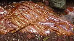 Liesegang rings (/ˈlzəɡɑːŋ/) (also called Liesegangen rings or Liesegang bands) are colored bands of cement observed in sedimentary rocks that typically cut across bedding.[1][2] These secondary (diagenetic) sedimentary structures exhibit bands of (authigenic) minerals that are arranged in a regular repeating pattern.[3] Liesegang rings are distinguishable from other sedimentary structures by their concentric or ring-like appearance. The precise mechanism from which Liesegang rings form is not entirely known and is still under research,[4] but there is a precipitation process that is thought to be the catalyst for Liesegang ring formation, referred to as the Ostwald-Liesegang supersaturation-nucleation-depletion cycle.[5] Though Liesegang rings are considered a frequent occurrence in sedimentary rocks,[6] rings composed of iron oxide can also occur in permeable igneous and metamorphic rocks that have been chemically weathered.[7]