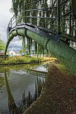 A ceremony to mark the start of the scheme was held on 24 October 1908, when 50 people travelled to Elkesley. Bishop E. King prayed for the success of the venture, the mayor, Councillor J. H. Mills used a silver spade to cut the first sod, and the party retired to the Hop Pole pub at Ollerton when torrential rain began to fall. The first borehole was cut to a depth of 570 feet (170 m), and when pumping tests proved successful, three further boreholes were cut. All had been finished by September 1909. Work on the pumps and buildings was then started.[22] Delivery of materials for the project was aided by the construction of a 3-mile (4.8 km) siding from near Checker House railway station to the borehole site. This was used to deliver two triple expansion steam engines, three Lancashire boilers, the pumps for the four boreholes, and materials for construction of the buildings.[23] Bower Brothers of West Bridgford were awarded the contract to lay 22 miles (35 km) of pipeline from Elkesley to Lincoln. The route followed the Great North Road, now the A1 road, southwards to Markham Moor, and then followed the A57 road to Lincoln. Most of it was made of cast iron pipes, 21 inches (53 cm) in diameter, but where the route crossed rivers or railways, lapped steel was used. A separate contract was awarded to Cleveland Bridge & Engineering Company for the section crossing the River Trent, where the steel pipe was carried on a bridge with six spans, next to the toll bridge at Dunham. They also built a crossing over the Foss Dyke at Saxilby, where the pipe is self-supporting, with an air release valve in the centre, and an access gantry to allow the valve to be serviced.[24] A similar arrangement was used at Odder where the pipeline crosses the River Till, although the rise is much less, because navigable headroom is not required. Because the pipeline followed the contours of the countryside, air release valves were fitted at all the high points.[25]