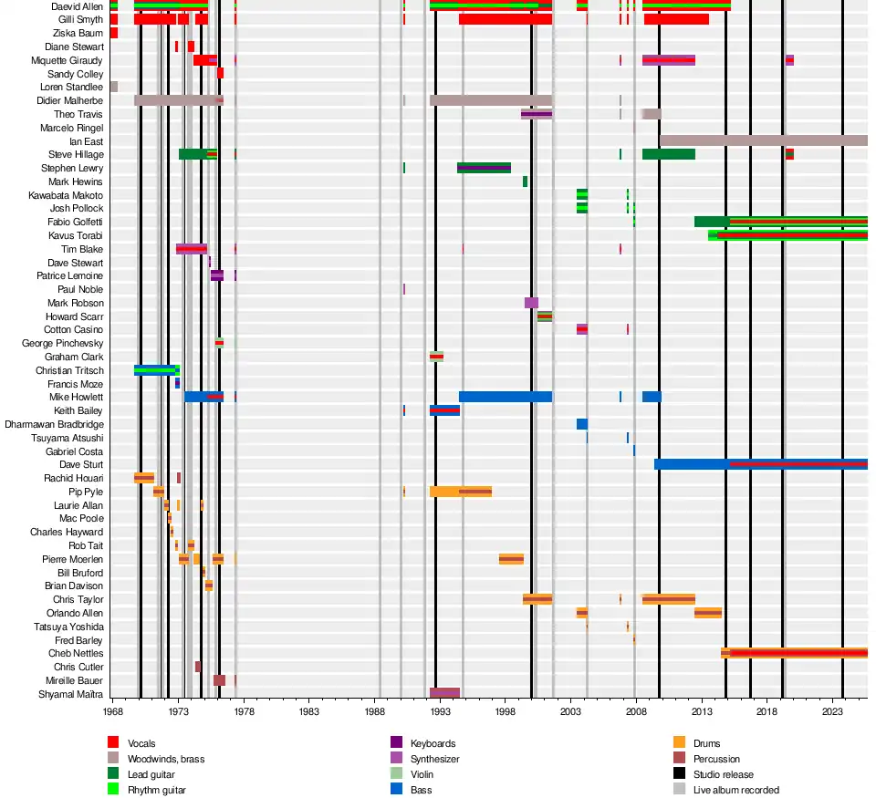 Gong are a Franco/British rock band founded by Australian vocalist/guitarist Daevid Allen and English vocalist Gilli Smyth in 1967.[1] The band's first recording line-up featured Allen and Smyth alongside bassist Christian Tritsch, drummer Rachid Houari and saxophonist/flautist Didier Malherbe.[2] The band's current line-up from Allen's death on 13 March 2015 features lead guitarist Fabio Golfetti (in 2007 and since 2012), bassist Dave Sturt (since 2009) saxophonist/flautist Ian East (since 2010), vocalist/guitarist Kavus Torabi (since 2014) and drummer Cheb Nettles (since 2014).[3]