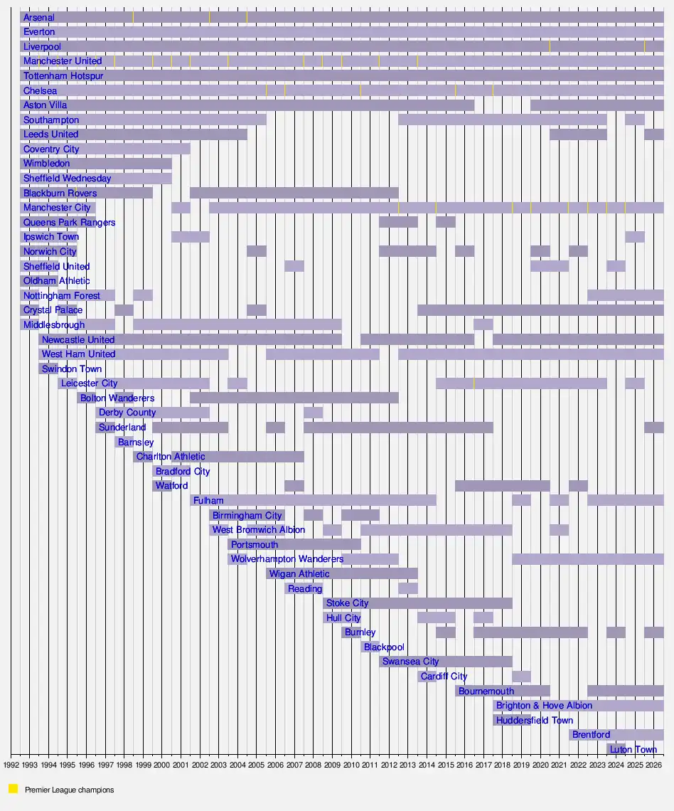 Eleven of the 22 founder members of the Premier League will compete in the 2025–26 season. Six (Arsenal, Chelsea, Everton, Liverpool, Manchester United, and Tottenham Hotspur) have contested every season of the Premier League. The remaining five (Aston Villa, Crystal Palace, Leeds United, Manchester City and Nottingham Forest), were also founder members, though each team has been relegated at least once in the past. Two clubs, Brighton & Hove Albion and Brentford, are not founding members of the Premier League, but have not been relegated since making their debuts in the Premier League after promotion in 2017 and 2021, respectively.