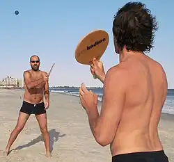 • Frescobol – played with solid, traditionally wooden rackets; typically between two players, the non-competitive aim is to maintain an airborne rally with a small rubber ball for as long as possible.[41][42]