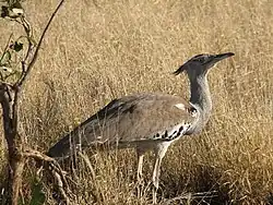 Bustards are large terrestrial birds mainly associated with dry open country and steppes in the Old World. They are omnivorous and nest on the ground. They walk steadily on strong legs and big toes, pecking for food as they go. They have long broad wings with "fingered" wingtips and striking patterns in flight. Many have interesting mating displays.