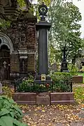 The cemetery, opened in 1863, was the third cemetery in the monastery complex, after the original Lazarevskoe Cemetery in the 1710s, and the Tikhvin Cemetery in 1823.[1] It became known as the Nikolskoe after the construction of the Church of St. Nicholas between 1868 and 1871 to the design of diocesan architect Grigory Karpov.[1][2] From its inception burial there was restricted to the elite of society, the monastery's Spiritual Council noting that "the Lavra cemetery is not open to everyone, as are the city cemeteries, but only a few persons from the government service and persons with honorary titles are buried here."[2] Part of the cemetery also served as the burial site for the Monastery's monks and the metropolitans of St. Petersburg, leading to the name Bratskoe (Russian: Братское), or "Brotherhood" section.[3] Wealthy patrons commissioned large chapels and crypts, with elaborate decorations and reliefs from prominent artists such as Nikolay Laveretsky, Ivan Podozerov, Robert Bach and Ivan Schroeder.[1]